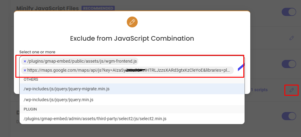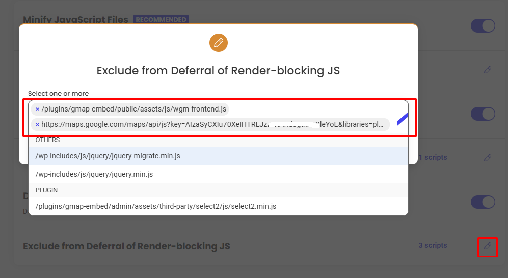 - Click the pencil icon or the edit button next to Exclude from Deferral of Render-blocking JS.