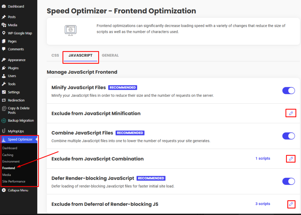 - From your WordPress Dashboard menu, go to Speed Optimizer > Frontend.